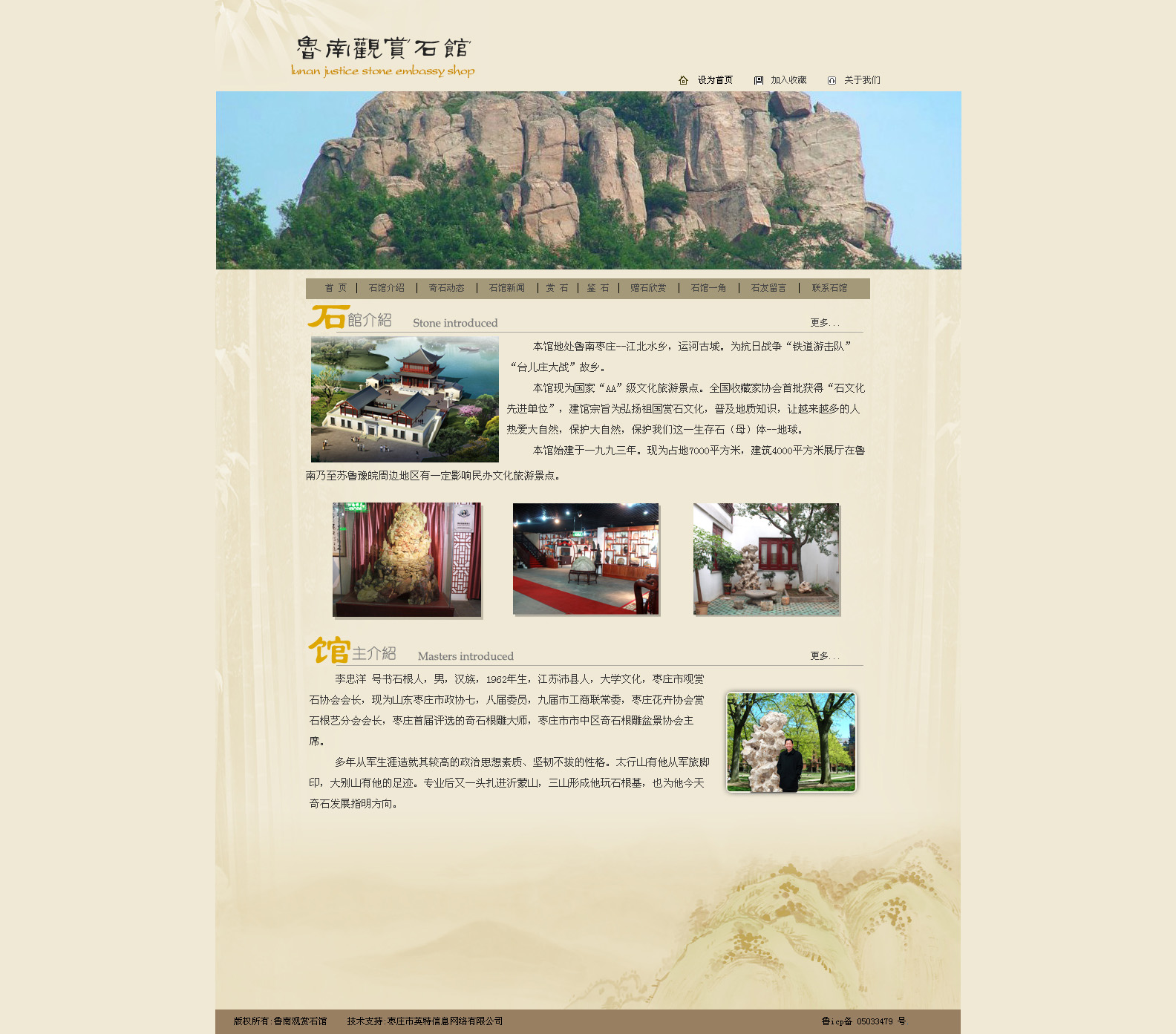本館地處魯南棗莊--江北水鄉(xiāng),運(yùn)河古城。為抗日戰(zhàn)爭“鐵道游擊隊(duì)”“臺(tái)兒莊大戰(zhàn)”故鄉(xiāng)。 本館現(xiàn)為國家“AA”級(jí)文化旅游景點(diǎn)。全國收藏家協(xié)會(huì)首批獲得“石文化先進(jìn)單位”,建館宗旨為弘揚(yáng)祖國賞石文化,普及地質(zhì)知識(shí),讓越來越多的人熱愛大自然,保護(hù)大自然,保護(hù)我們這一生存石(母)體--地球。 本館始建于一九九三年,F(xiàn)為占地7000平方米,建筑4000平方米展廳在魯南乃至蘇魯豫皖周邊地區(qū)有一定影響民辦文化旅游景點(diǎn) 棗莊網(wǎng)站建設(shè) |