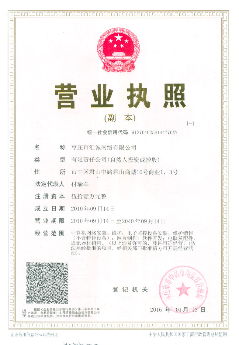特提供三證合一后的新?tīng)I(yíng)業(yè)執(zhí)照副本如下 棗莊市匯誠(chéng)網(wǎng)絡(luò)有限公司營(yíng)業(yè)執(zhí)照(統(tǒng)一社會(huì)信用代碼:9137040256144770XY)